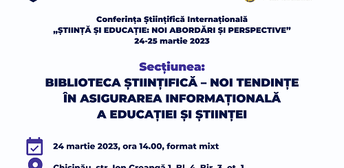 Conferința Științifică Internațională „ȘTIINȚĂ ȘI EDUCAȚIE: NOI ABORDĂRI ȘI PERSPECTIVE”, secțiunea „BIBLIOTECA ȘTIINȚIFICĂ – NOI TENDINȚE ÎN ASIGURAREA INFORMAȚIONALĂ A EDUCAȚIEI ȘI ȘTIINȚEI” 23/03/2023
