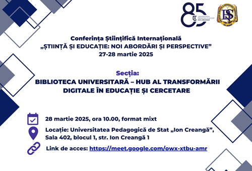 În data de 28 martie 2025, Biblioteca Științifică UPSC a luat parte la Conferința științifică internațională „Știință și educație: noi abordări și perspective”. Secția 4, intitulată „Biblioteca universitară – hub al transformării digitale în educație...