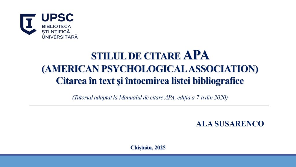 Biblioteca Universitară a realizat o prezentare practică dedicată utilizării corecte a stilului de citare APA, unul dintre cele mai frecvent utilizate standarde internaționale în domeniul academic. Tutorialul explică regulile de citare în text și întocmirea listei bibliografice, oferind exemple clare și recomandări utile pentru studenți, masteranzi, doctoranzi și cadre didactice.