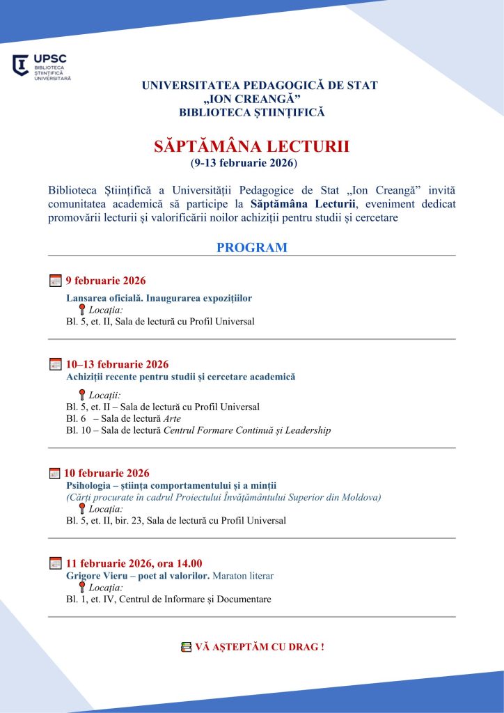 Biblioteca Științifică a Universității Pedagogice de Stat „Ion Creangă” organizează, în perioada 9–13 februarie 2026, Săptămâna Lecturii – un eveniment dedicat promovării culturii lecturii și valorificării noilor achiziții editoriale destinate studiului și cercetării academice.
