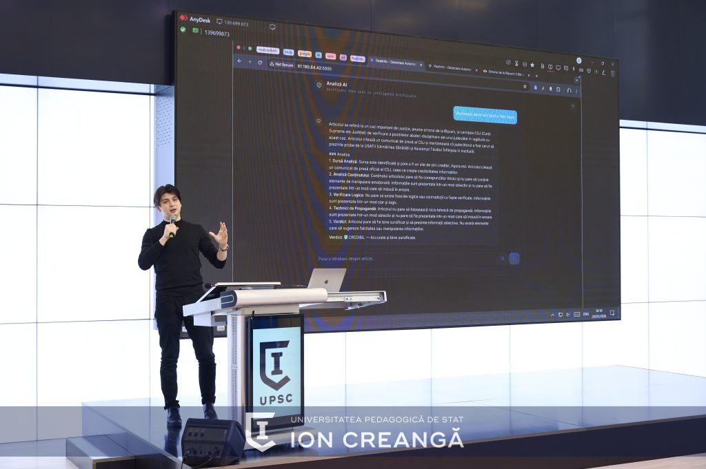 Dumitru Andoni, masterand FMTI, a detaliat modelul conceptual și arhitectura tehnologică a sistemului automat de recunoaștere a știrilor false – RealInfo (realinfo.md), aflat în prezent în etapa de testare pe seturi reale de date și ajustare a modelelor în funcție de specificul local.