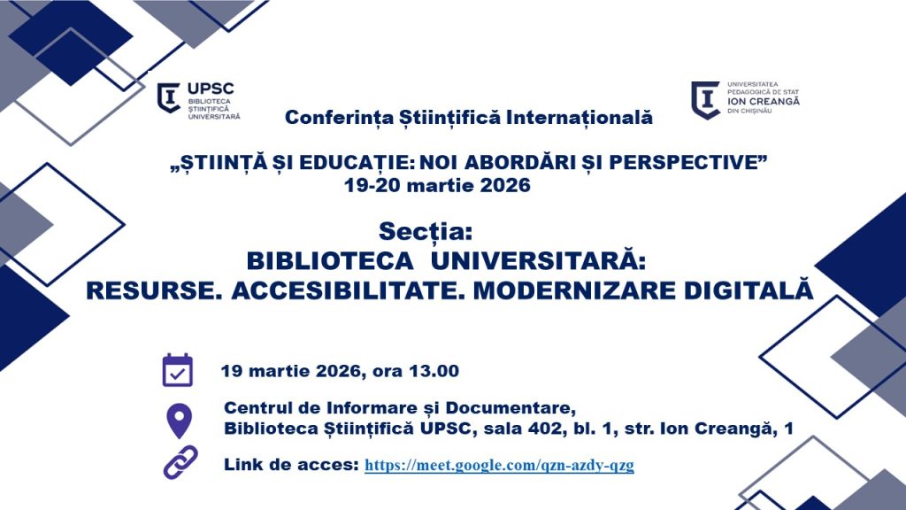 Eveniment dedicat inovației și dezvoltării bibliotecilor universitare în era digitală by Biblioteca Științifică UPSC · 17/03/2026 Vă așteptăm cu drag la acest eveniment ! Link de acces: https://meet.google.com/qzn-azdy-qzg Program: https://drive.google.com/…/17LvMBxJv2izsBrExWSK…/view…