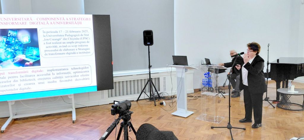 Un moment important al evenimentului a fost prezentarea susținută de Ecaterina Scherlet, director al Bibliotecii Științifice UPSC, CBD, cu tema „Dezvoltarea bibliotecii universitare prin transformarea digitală”, în care a fost prezentată o veritabilă istorie de succes a dezvoltării bibliotecii digitale. Intervenția a evidențiat direcțiile strategice de modernizare a bibliotecii universitare în contextul transformării digitale, cu accent pe facilitarea accesului la informații, digitalizarea colecțiilor și dezvoltarea competențelor digitale ale utilizatorilor.