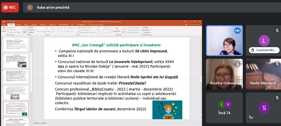 În data de 21 decembrie 2021, DIRECŢIA GENERALĂ EDUCAŢIE TINERET ŞI SPORT în parteneriat cu Biblioteca Științifică a Universității Pedagogice de Stat „Ion Creangă”, Centrul Metodologic Departamental a desfășurat atelierul profesional „TENDINȚE INTERNAȚIONALE ȘI PROVOCĂRI PENTRU BIBLIOTECI ÎN ANUL 2022”.